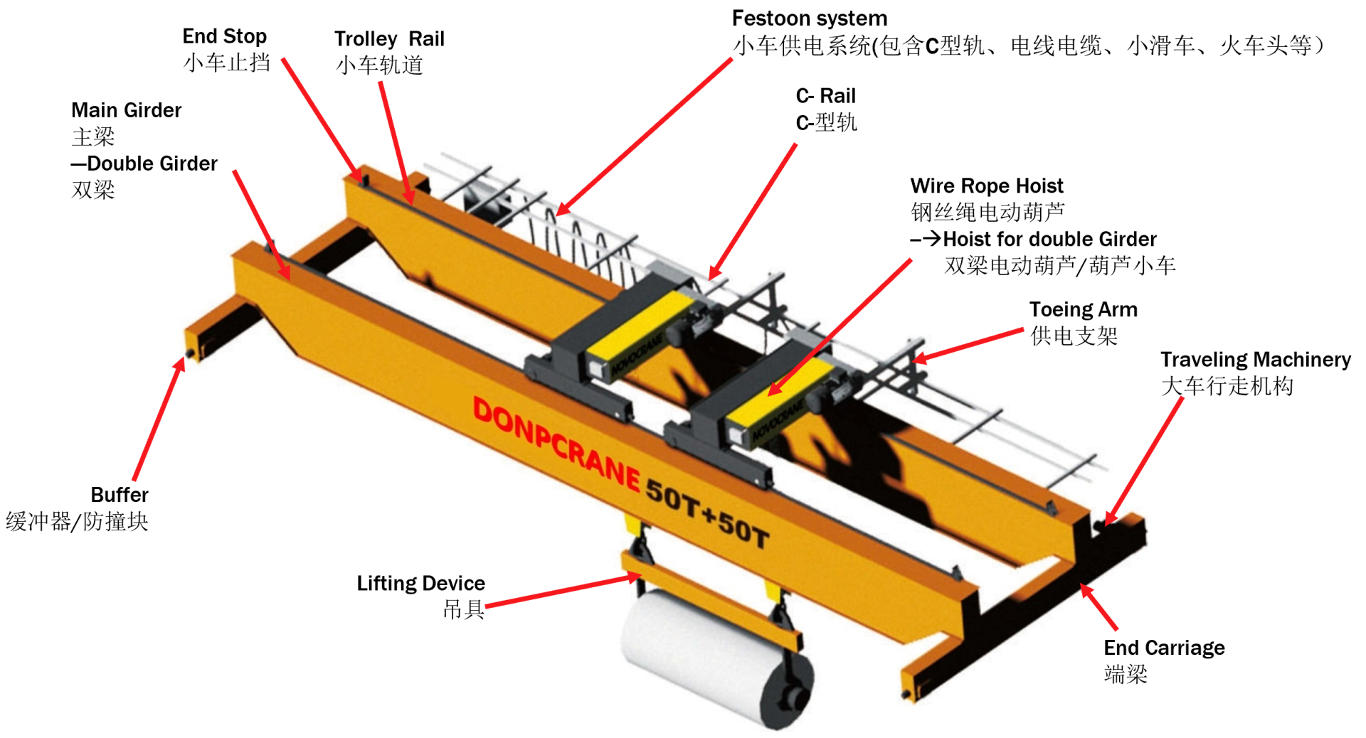 Safety protection Gearmotor locker rope to protect drop Rain cover for outside hoist, driving units, electrical cubicle Warning indicator: flashing lights and warning sound Wireless infra-detector for anti-collusion |