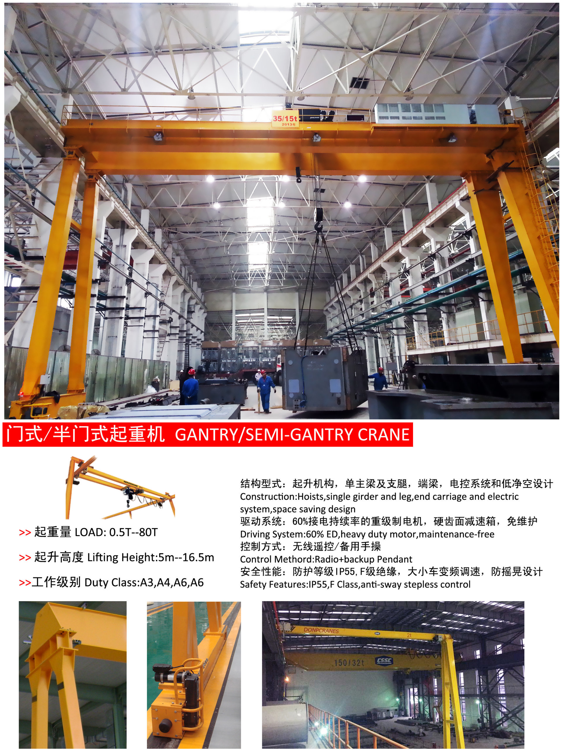 Mechanical feature Single welding box girder, DIN/FEM standard deflection Steel tube legs Material Fe37 or Fe52 Whole length CNC cutting for complete web plate, high deflection accuracy High quality autometic welding and NDT inspection Shot-blasting Sa2.5 for complete girder after welding, stress release Epoxy zinc rich high quality paiting, 2x2 with 140μm 10.9 class High tension bolts mouting between girder and legs, life time safety connection Vertical gear motor driving,more safety and smaller space High proection class IP55, F class, 40% ED End carriage equipped with anti-friction bearings,cellular buffers,derailment protectors